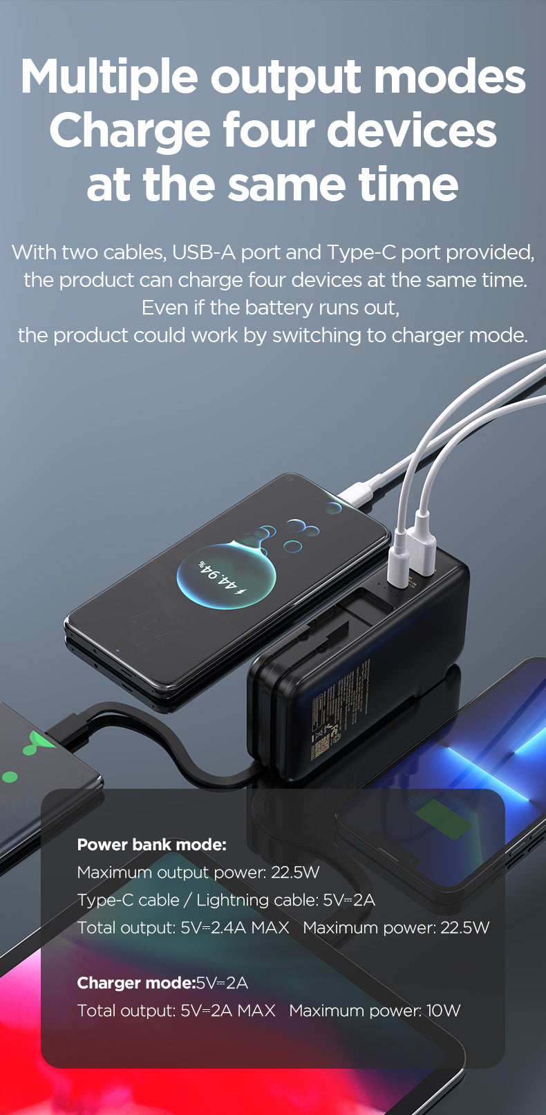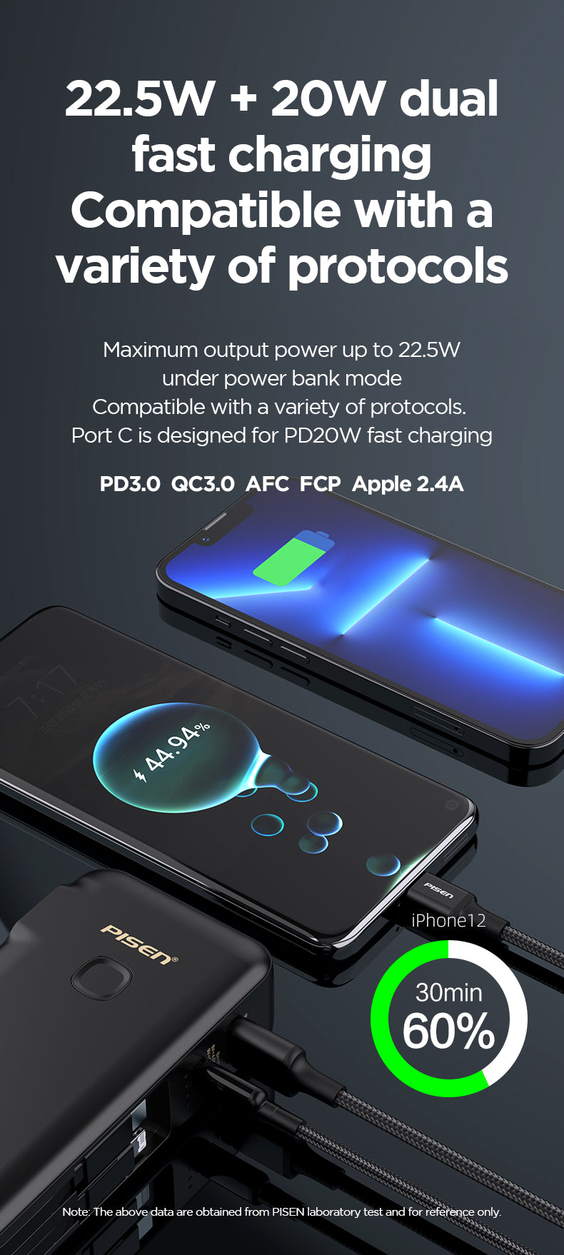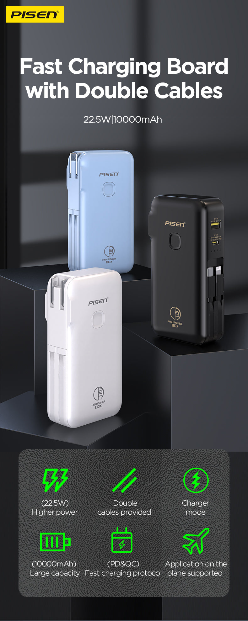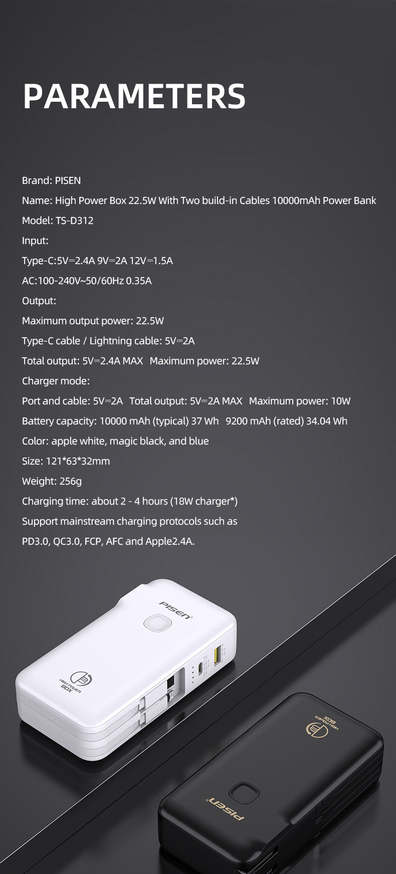 PISEN High Power Box 22.5W With Two build-in Cables 10000mAh Power Bank TS-D312