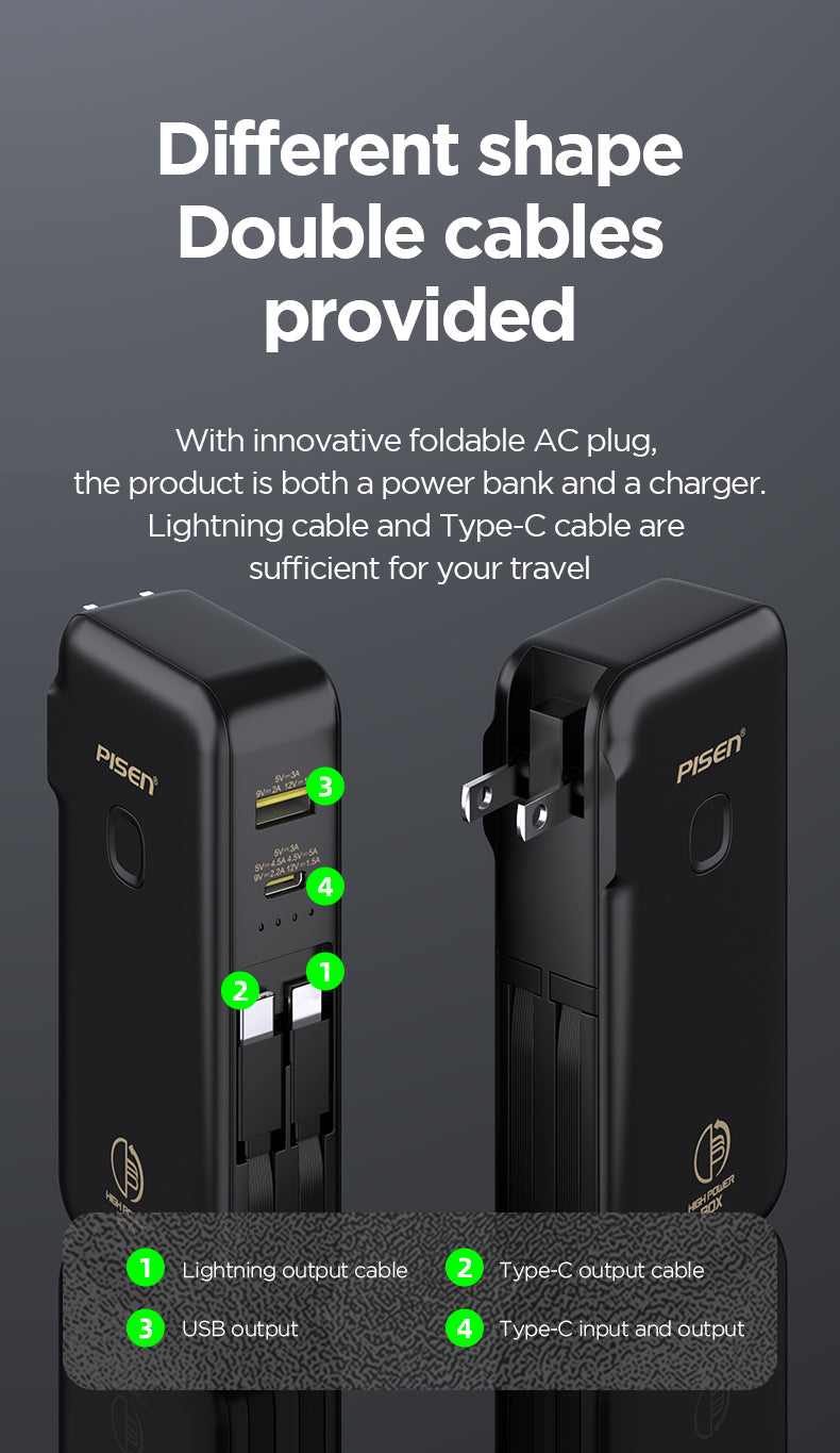 The PISEN Power Box is your ultimate travel solution, combining high power output and convenience in a sleek design. With built-in cables and a foldable AC plug, it’s perfect for on-the-go charging without the hassle of extra accessories. Whether you're in transit or at home, this power bank ensures you stay connected.