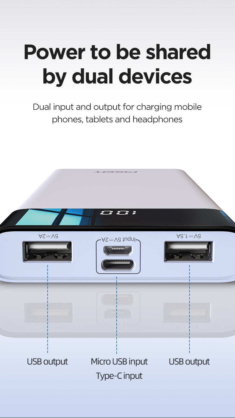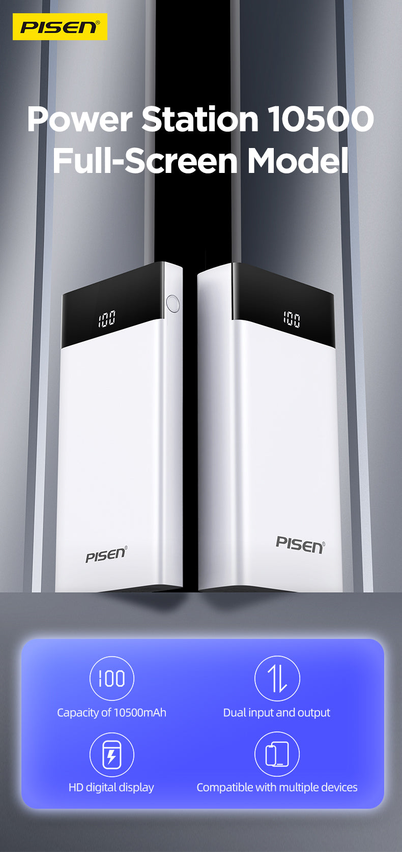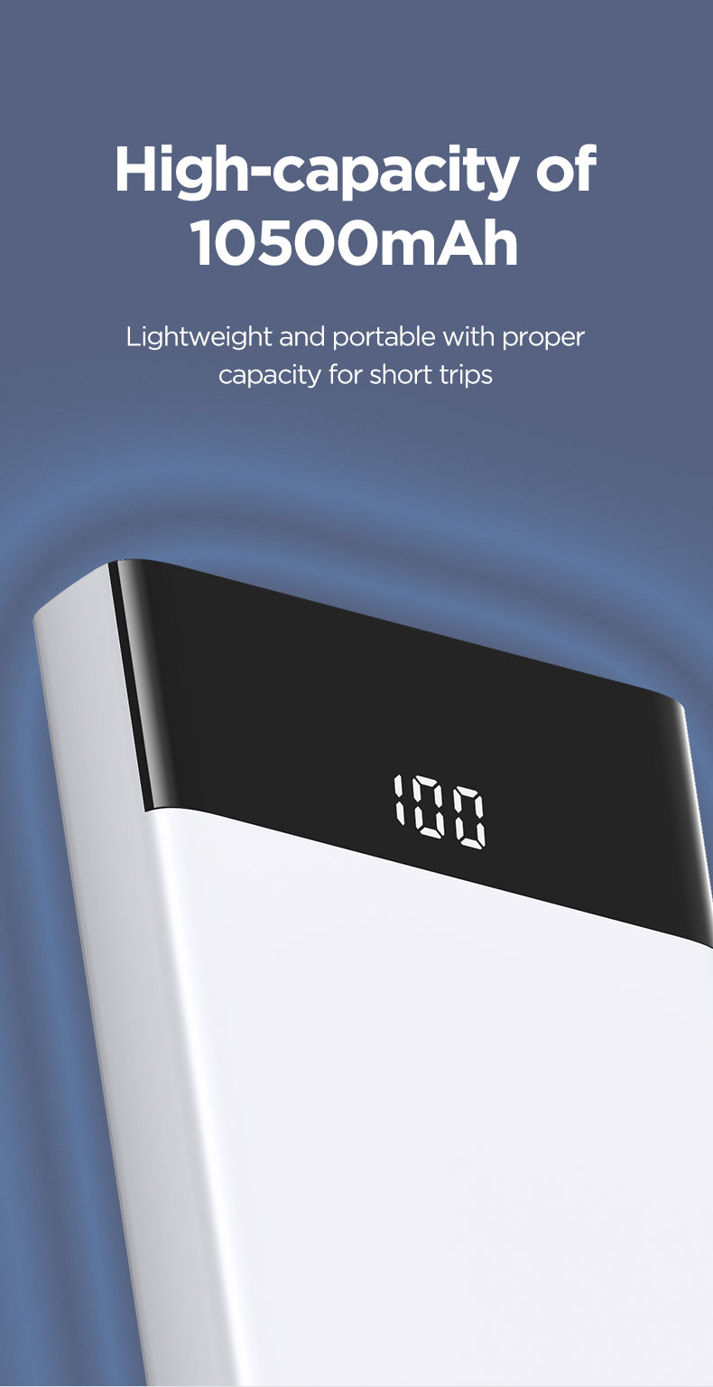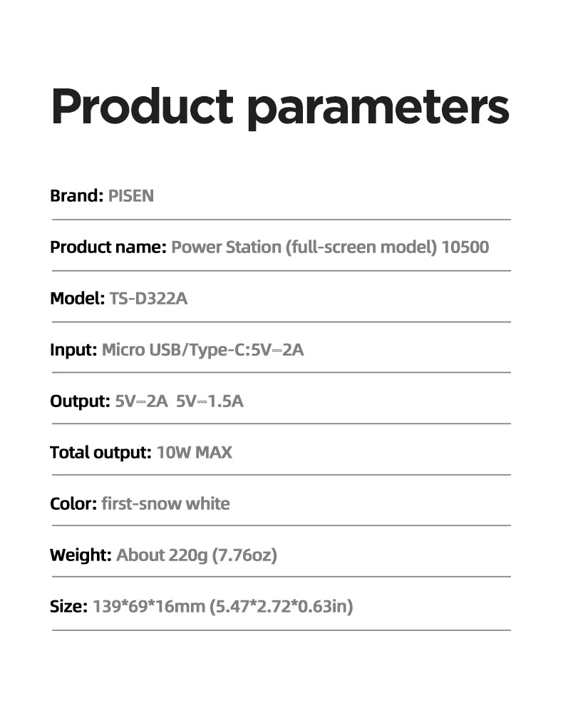 The PISEN Power Station (Full-Screen Model) 10500 is designed for everyday convenience with a sleek First-Snow White finish. With 10W Max total output and dual charging ports, this compact 220g power bank keeps your devices powered on the go.